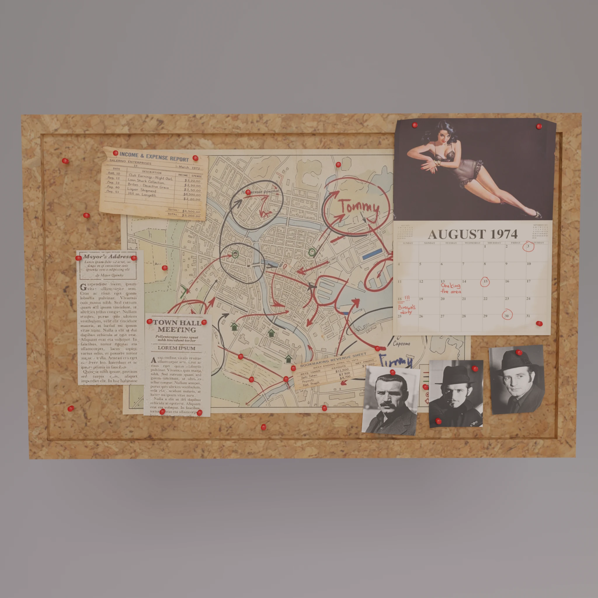 Пропсы и рендеры по теме - темный кабинет босса. Со столиком для наблюдения, заваленными пачками долларами, дробовиком M870 и картой окраин на стене. Детали: массивный сейф с наличкой, мишень для дартс, кожаные кресла, лампа под потолком, разбросанные бумаги и грязный пол. Фотореалистичные текстуры дерева, металла и кожи. Форматы: .fbx, 4K рендеры + PBR-материалы.