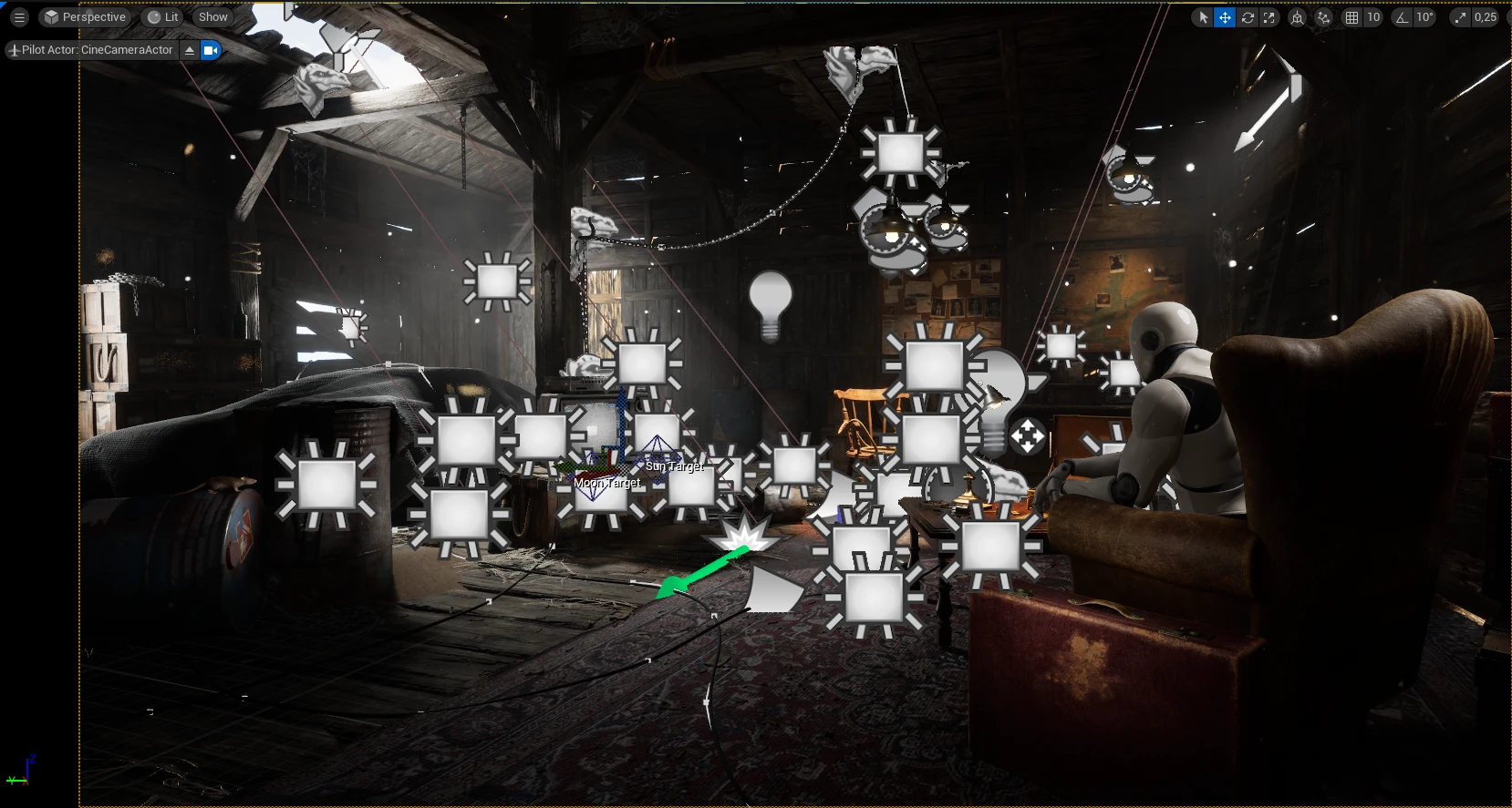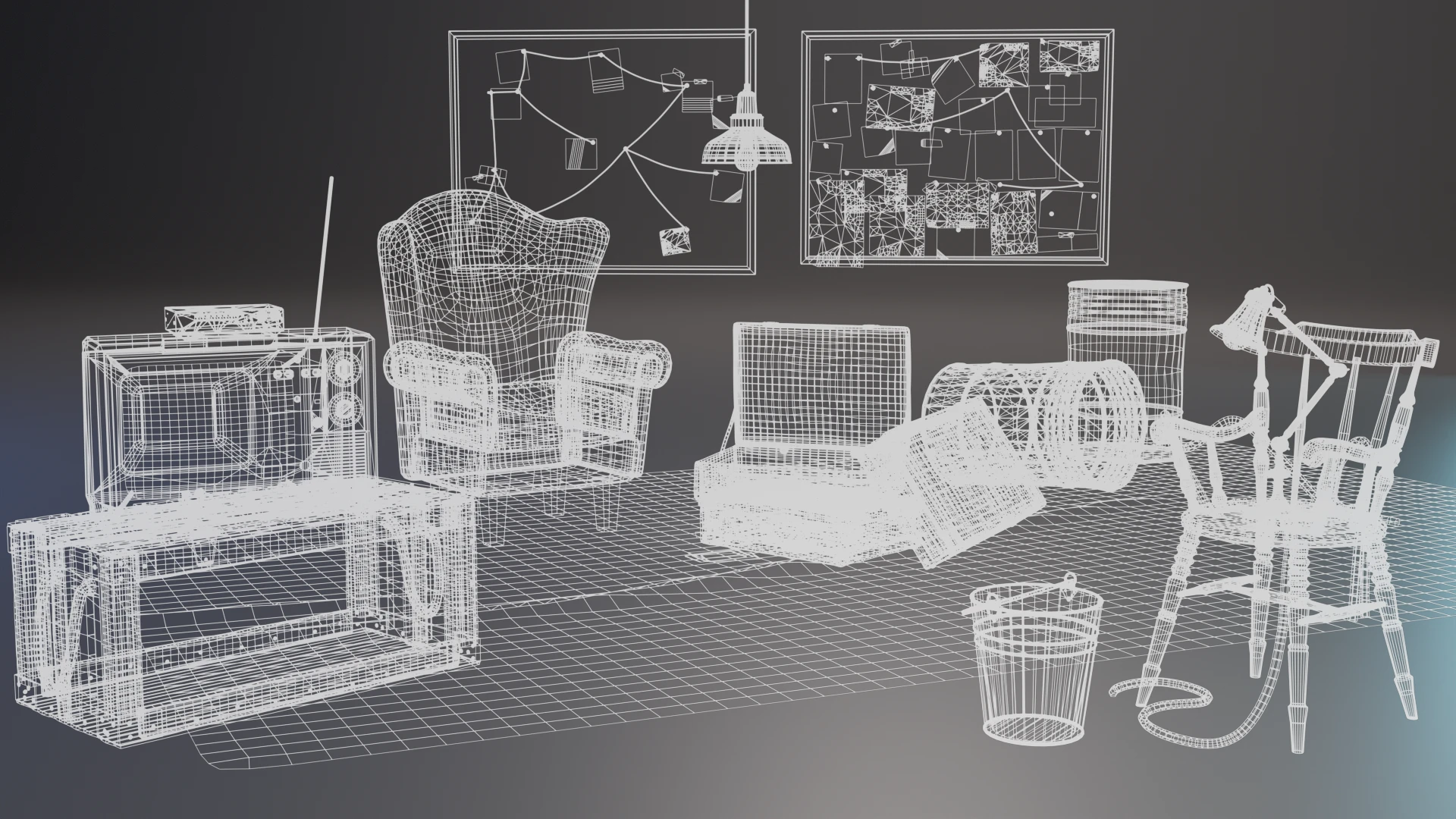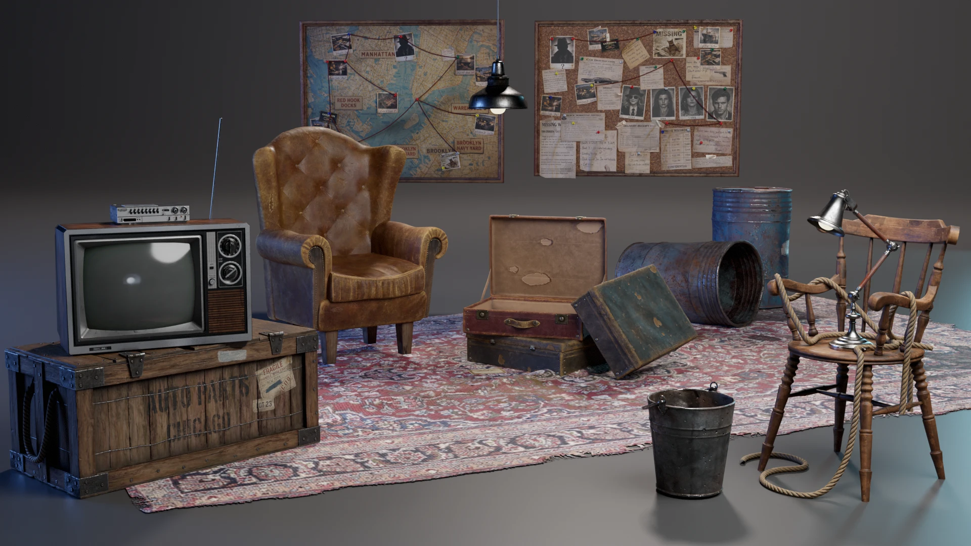 Цепи, провода и верёвки создавались с использованием сплайнов, что дало дополнительную гибкость при сборке сцены.