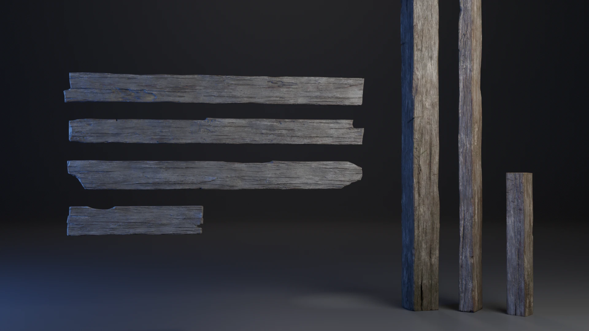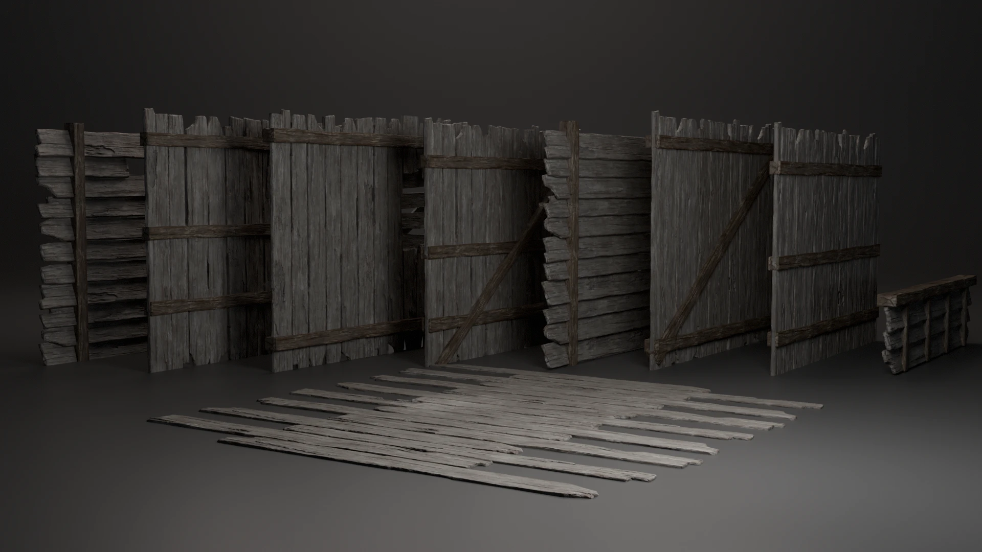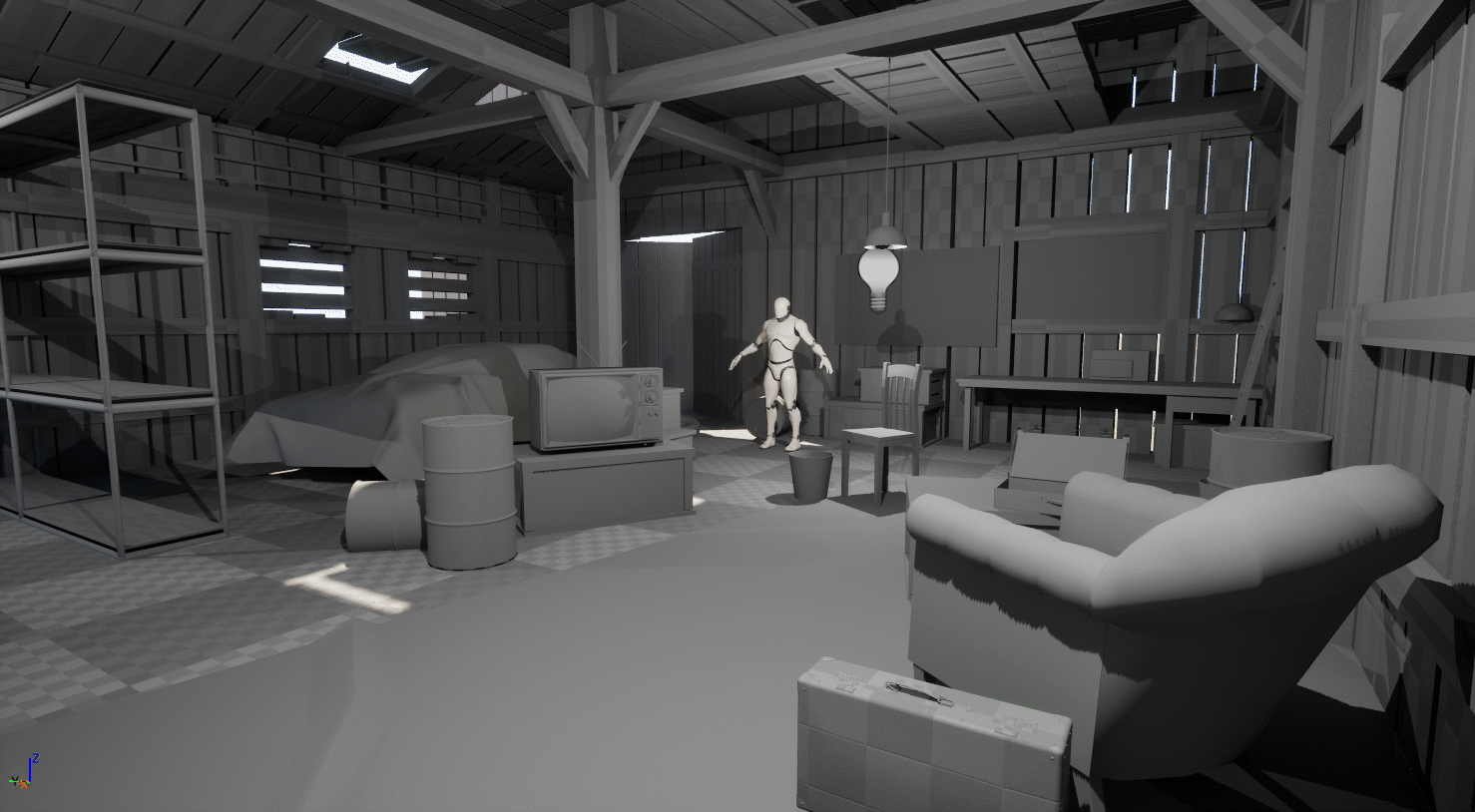 Ангар собран из модульных элементов : стены, пол, крыша и стремянка созданы на основе одних и тех же досок и балок. Это позволило ускорить процесс и быстрее перейти к более сложным задачам, не зацикливаясь на базовой структуре помещения.