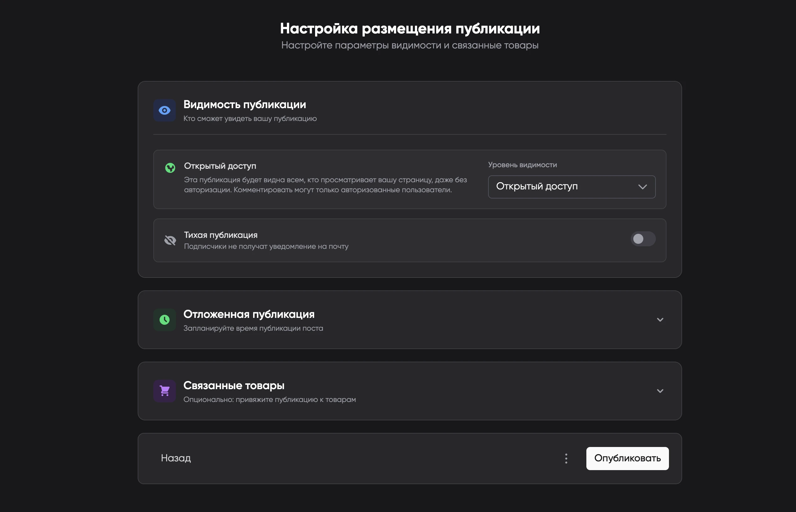 - Возможность запланировать публикацию поста на определенное время