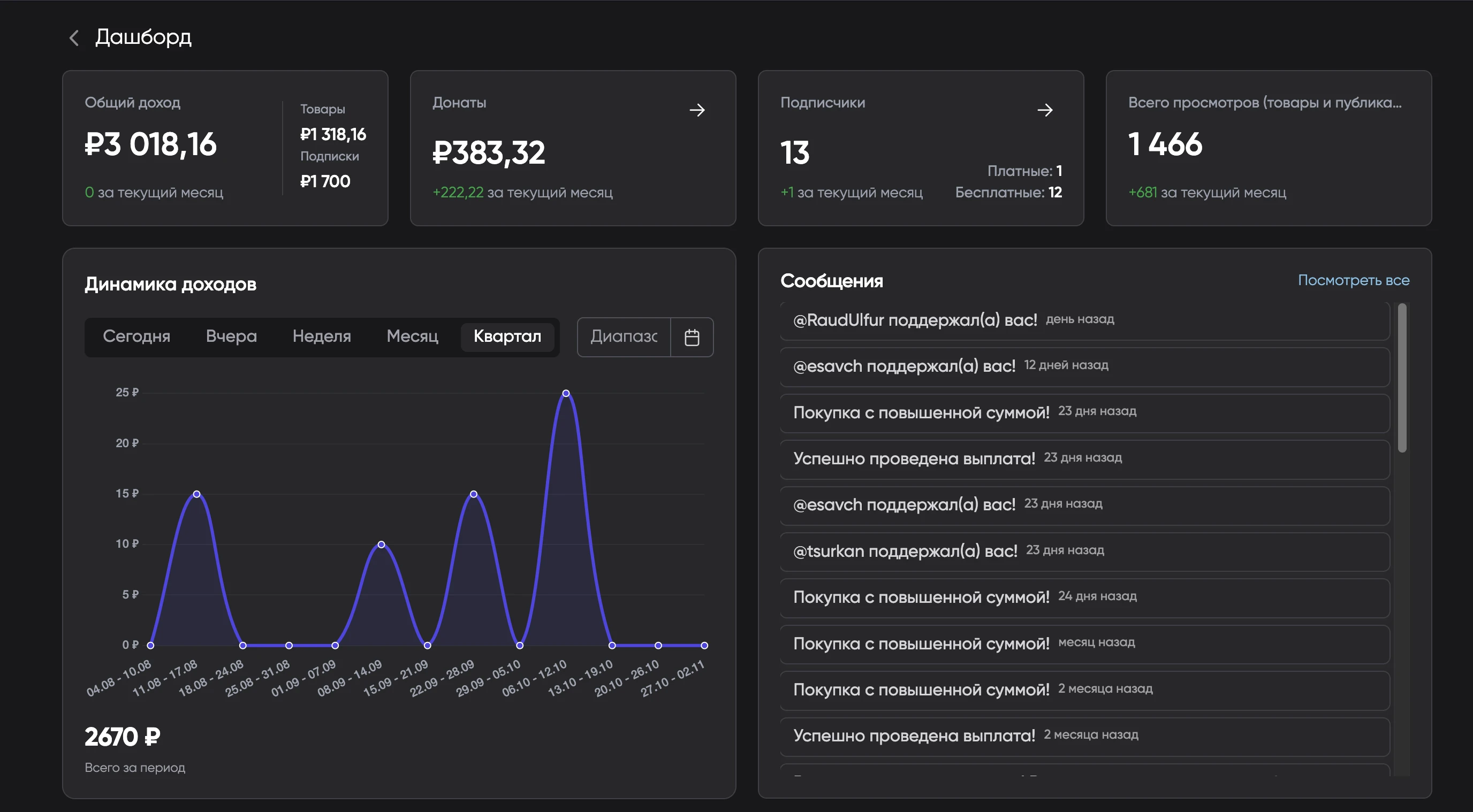 - Графики доходов и активности