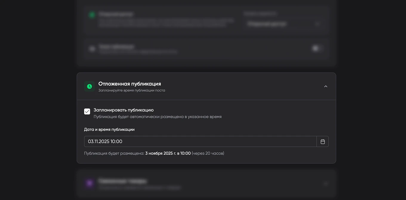- Автоматическая публикация в заданный момент