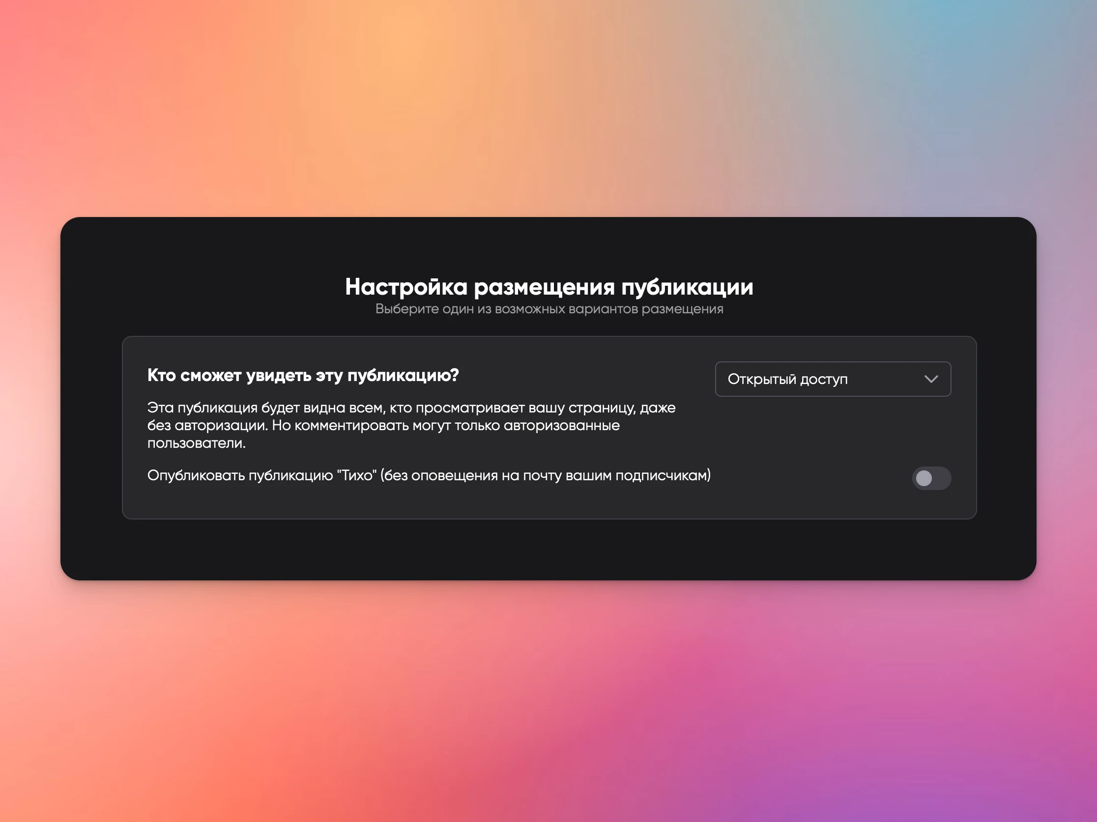 Порой хочется поделиться информацией, но так, чтобы она не отправлялась на почту вашим подписчикам. Для этого в настройках размещения публикации появился режим "тихой" отправки