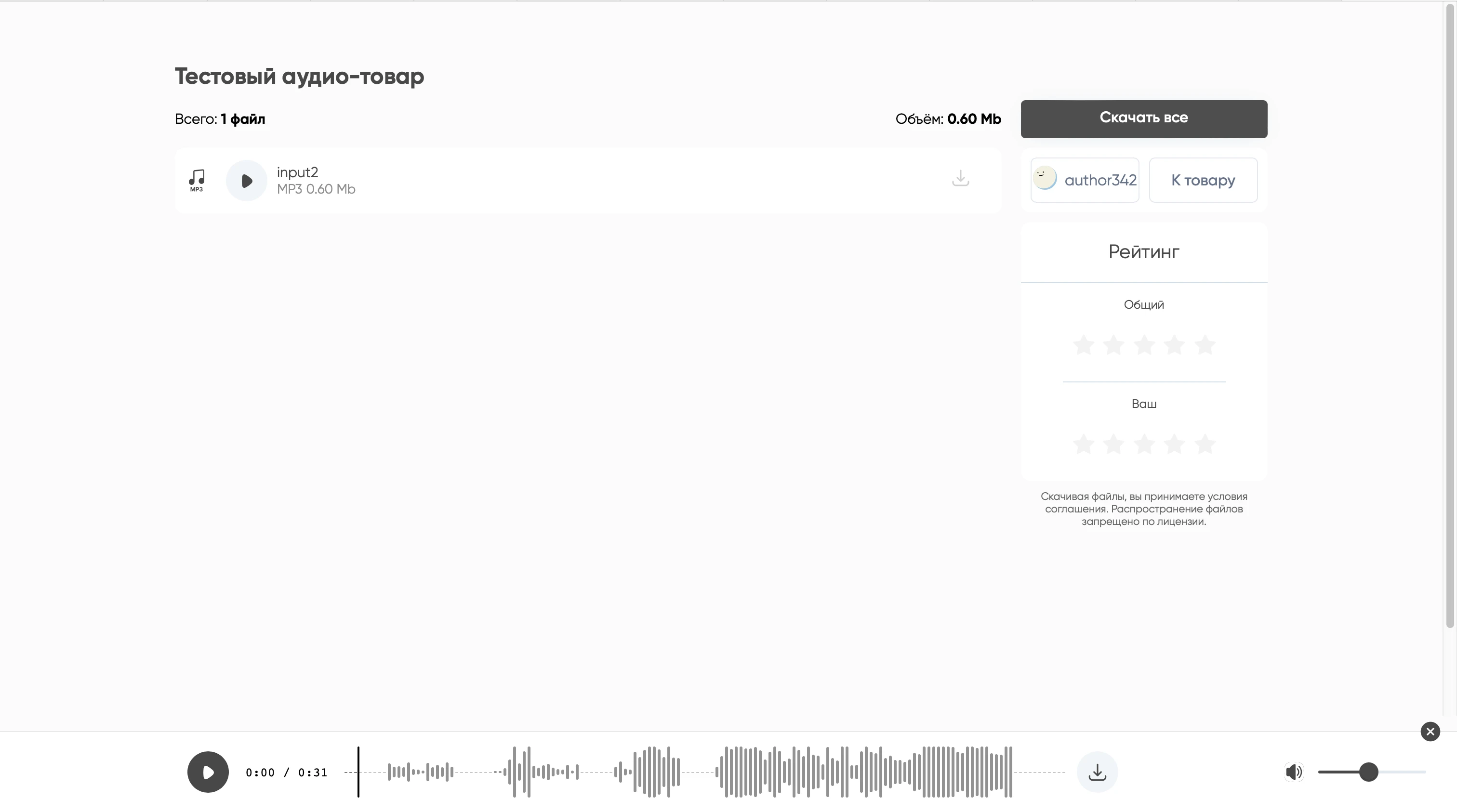 На большом экране вы сможете видеть "пики", чтобы понять, где тишина, а где активное действие. Вы также можете скачать проигрываемый аудио-файл, перейти из проигрывателя на другие страницы и вернуться обратно, так как блок слева с товаром - это ссылка на него.